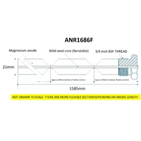 Notes | Specifications DIRECT REPLACEMENT FOR RHEEM PART NUMBER 221951 or 221935 Hot water units: Aquamax Electric 400L (Not E Series) Edwards solar 400L Everhot 400L Solahart 430L SLV, MDV Series Vulcan Electric 400L Material: Magnesium Length: 1665 mm FLEXIBLE ANODE. Segmented at 300mm section so anode can be installed in limited headroom applications. Diameter: 21mm 3/4 BSP inch Thread. Requires 27mm socket to remove and refit. NOTE: Price is for ONE(1) anode. **TIP: Comes with plumbing tape but you may need additional plumbing tape applied depending on fitment** **2 YEAR WARRANTY covers anode manufacturer, specifically the weld and construction of the steel nut** |