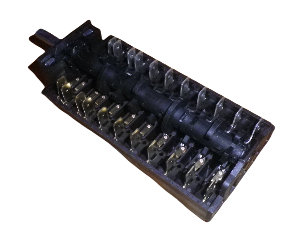 | Notes | Technika, Euromaid 9 Position Oven Selector Switch.Part No. SE988, FD109.Replaces Part Nos. PA210032013, ED300024, PA2100320008 (OLD), PA210032007 (OLD), 3070047, 33301002, 1870086BWS, OSPFST13.9 position oven select switch used in some late model underbench ovens. Suits some Technika, Euromaid, Ardo & ARC models including:-Technika: T640TE8, TU950TME8, TU950TLE8, TU950TME8BG,TU950TLE8G, GHE09TDSS-4, CERHE09PSS-2, GHE09TD-4, TU950TME8, TU950TLE8, TEG95UA, TU950LE8, GHE09TDSS-4, CERHEO9PSS-2, MCTU950TME8LPG, TU950ME3SF, T948SS-3, GHEO9TP-0, RV89EIX, TU950TLE8G, TU950TME8, RVU90FW, RV89EIX, RV94881, RVU90CERSS, TEG95UA, AOM6SE1, FC9PS, GE90S, GE9SS, CERHE09PSS, B6GEFTSS3, B9GEFTSS, B9GEFTSS-3LPG, B9GEFTPROSS-3, MCTU950TME, MCTU950TME8LPG, RVU60WSS, RVU60WB, RVU90CERB, RVU90FWB, RVU90FWSS, TEG95UA, TU950TLE8, TU950TLE8G, TU950TLE8LPG, TU950TME8, TU950TME8G, TU950TLE8SB, TU950TME8SB, TU950ME3SFRL, VUC90SS, AOM6SE1, B6GEFTSS3, B9GEFTSS, B9GEFTSS-3LPG, CERHE09PSS, FC9PS, MCTU950TME, MCTU950TME8LPG, RVU60WSS, RVU60WB, RVU90CERB, RVU90FWB, RVU90FWSS, TEG95UA, TU950TLE8, TU950TLE8G, TU950TLE8LPG, TU950TME8, TU950TME8G, TU950TLE8SB, TU950TME8SB, TU950ME3SFRL, VUC90SSArda: RVU90FW, RV89EIX, RV94881, RVU90CERSS, TEG95UA,ARC: AOM6SE1,Euromaid: FC9PS, GE90S, GE9SS and others.6mm D-Shaped shaft. 11 cam banks, 11 SPST switches. Banks 1 & 2 are linked, Banks 3 & 4 are linked, Banks 5 & 6 are linked, Banks 7, 8 & 9 are linked and on the opposite side Banks 1 & 2 are linked and Banks 9 & 10 are linked.Contacts rated 16Amp.This switch replaces other switches with a different configuration. A wiring diagram is included showing cross references with two other switch styles.Note there are other switches that look similar. Contact us with your brand and model number to check suitability if not listed |