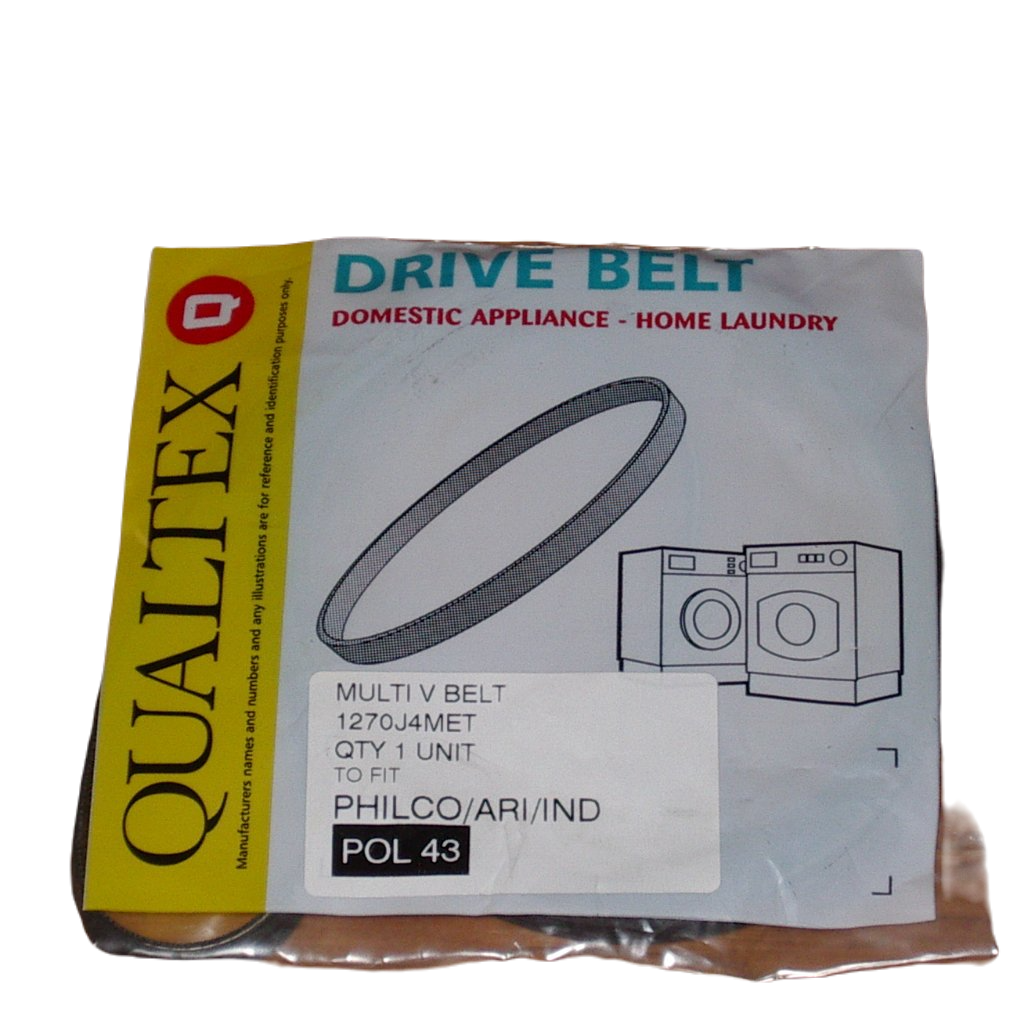 | Notes | Samsung, Philco, Ariston, Indesit, Merloni, Electrolux, AEG, Bosch Front Loader Washing Machine Main Drive Belt.Part No. POL43, B074, 1270J4, 500J4.Similar to POL92, 228368, BLT9116, UNI8717, 50.01.12.70., 520, 041587, 8996451209200, 027206, 535C71060001, 8996452374003, Bosch part no. 154142 & Samsung Part No. 6602-001072, 1270J5.Poly-V drive belt, manufactured by Qualtex, type PJ1270/500J.Length 1270mm, 50inches, width 10mm, 4 ridges.This belt is appropriate for many European brands and models including:-AEGLAV1105 U B, LAV1105 U B, LAV1105 U D, LAV1105 U D EU, LAV1105 U W, LAV1105 U W EU, LAV1135 I D, LAV1135 I W, LAV1135I D, LAV1135I W, LAV1418 W, LAV1435I B, LAV1435I D, LAV1435I W, LAV50400, LAV50420-W, LAV50420-W, LAV50500, LAV50520-W, LAV50600, LAV50620-W, LAV50700, LAV50720-W, LAV520, LAV550 BZ D, LAV61300, LAV61300-W, LAV620, LAV6205, LAV625 A, LAV625 A, LAV625 A, LAV625 A, LAV625 W, LAV625 W, LAV625 W, LAV625 W, LAV625 W, LAV625 W, LAV625 W, LAV625 W, LAV625 W, LAV625 W, LAV625 W S NSF, LAV625-10, LAV6250, LAV6250, LAV6250 W, LAV62600-W, LAV62600-W, LAV630, LAV630 WS, LAV635, LAV635 SENS W, LAV635 W, LAV635 W, LAV635 W, LAV635 W, LAV635 W, LAV635 W, LAV635 W, LAV635 W, LAV635 W EU, LAV635 WS, LAV6350 SENS., LAV6350 SESNS., LAV645 A, LAV645 W, LAV645 W, LAV645 , LAV645 W, LAV645 W, LAV645 WS, LAV6450 SENS., LAV6450 SENS., LAV6450 SENS., LAV655, LAV655 W EU, LAV6550, LAV6550 W, LAV6550 W, LAV6550 W, LAV6552 SENS., LAV6555, LAV6555-W, LAV665 W, LAV665 W EU, LAV665 WS, LAV6650 SENS., LAV6650 SENS., LAV675 W, LAV675 W EU, LAV6750, LAV6750, LAV6750 W, LAV6750 W, LAV685 W EU, LAV695 W, LAV695 W, LAV6950, LAV6950, LAV6950 SENS., LAV6950 SENS., LAV6950 W, LAV6955, LAV6955, LAV6955-W, LAV715 SENS W, LAV715 W, LAV715 W, LAV715 W, LAV715 W, LAV715 W, LAV72600, LAV72620-W, LAV74600, LAV74600-W, LAV74600-W, LAV74600-W, LAV74620-W, LAV74620-W, LAV74620-W, LAV7550, LAV7550 W, LAV795 W EU, LAV85729-W, LAV86700, LAV86700-W, LAV86720-W, LAV86720-W, LAV86800-W, LAV9029 W, LAV9029 W D, LAV9033 W, LAV9039 W, LAV9039 W D, LAV9049 W D, LAV9059 W D, LAV90600, LAV9069 W, LAV9079 W D, LAV925 W, LAV925 W D B NL, LAV935 W, LAV935 W EU, LAV945 W D NL, LAV955 W D, LAV9550, LAV9550 W, LAV961 BZ, LAV961 W, LAV975 W, LAV9750, LAV976 W, LAVB1100 W, LAVB1200-W, LAVB1200-W, LAVB2000-W, LAVBELLA 1005 W, LAVBELLA 1100 W, LAVBELLA1100 WD NL, LAVC1028 W, LAVC1128 W, LAVC1218 W, LAVCARAT1028 W D, LAVCARAT1128 WD, LAVCARAT1428, LAVDIPLOMAT S-W, LAVDIPLOMAT W, LAVNOVA WS, LAVP1000 W, LAVPRINC SL W, LAVPRINCESS 1000 W, LAVPRINCESS SL W D, LAVPRINCESS W.AristonA817, A826, AB1030CUK, AB1036TUK, AB1036UK, AB836UK, AB930CUK, AB936UK, AD10UK, AF1083T/1UK, AI1047MT, AI834T, AI837MT, AI837T, AI847MT, AL1046TUK, AL1059TUK, AQ800, AV1037, AV1037W, AV1048CUK, AV824, AV827, AV834CUK, AV835, AV838CUK, AV839, AW820, CW810, S1000UK, S800UK, SWD1000UKBoschWTA3100GB/01, WTA3100GB/02, WTA3100GB/05, WTA3100GB/06, WTA3100GB/07, WTA3100GB/09, WTA310LGB/07, WTA310LGB/09, WTA3200GB/01, WTA3200GB/02, WTA3200GB/04, WTA3200GB/06, WTA3200GB/09, WTA3400GB/01, WTA3500GB/01, WTA3500GB/02, WTA3500GB/04, WTA3500GB/06, WTA3500GB/08, WTA3600GB/01, WTE5820GB/01, WTE5820GB/02, WTE5820GB/04, WTE5820GB/08, WTE6920GB/01, WTL5100GB/05, WTL5100GB/07, WTL5100GB/09, WTL5100GB/11, WTL5200GB/02, WTL5201GB/04, WTL5201GB/09, WTL527SGB/04, WTL527SGB/09, WTL5400GB/01, WTL5400GB/02, WTL5400GB/04, WTL5400GB/08, WTL5500GB/01, WTL5600GB/01, WTL5600GB/02, WTL6100GB/01IndesitWDG1095GH(G), WDG1095WG, WDG985BG, WDG985WG, WDN1079WG, WDN966BG, WDN966WG, WDS1000UK, WG1030G, WG1033TG, WG1034TG, WG1085WG, WG1086G, WG1130TG, WG2020WG, WN1060WG/2, WN1063WG, WN1072WR/2, WN1080WG, WN1096BG, WN1096WGOceanS900PhilcoL103RX L1046RX LA1036 LAP1046 L82RX PA207 PA2107DBS PA2197DDS PD297 RWM1262 RWM832SI W112RE W135RLE WD1109AL WD1190SE WD1209SE WD2000DB WDC133 WD1898 WM1000E WM1200AL WM1210DB WM1300 WM1300SE WM1891 WM1894 WM2001SLT WM850 WM850E 7106 7107 7107V1 7107V2BendixWDB1074TAlso suits Vision Fitness exercise bicycle machine ES600 (XT900) |