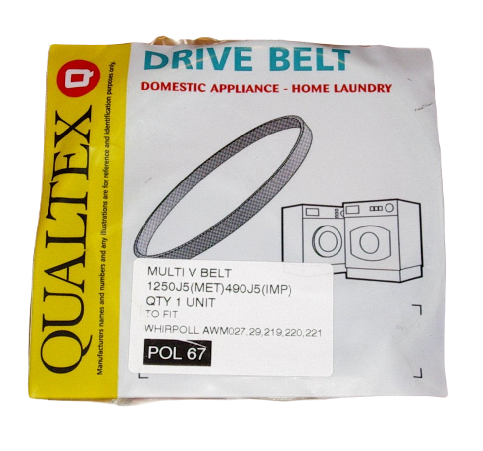 | Notes | Whirlpool, Bauknecht, Ikea Front Loader Drum Drive Belt.Qualtex Part No. POL67, 1250J5EL (Metric), Megadyne EL1250J5.Other OEM part numbers - 481235818056, 481235818053, 481235818054, 481235818153, 751610068, 19173, UNI3336, 1250J5Belt Length 1250mm, Width 11.8mm, Type J. 5 Ribs.Appropriate for many Whirlpool, Bauknecht & Ikea front load washing machines.Models include:-Bauknecht: WAI2530/WS-GB, WAI2542/2, WAI2542/2-GB.Ikea, Ignis: AWD593, AWF591, AWP044, AWP045/3, AWP046.Whirlpool: AWM027, AWM029, AWM219, AWM220, AWM221, AWM228, AWM229, AWM232, AWM236, AWM243, AWM321, AWM322, AWM323, AWM324, AWM325, AWM326, AWM327, AWM328, AWM330, AWM336, AWM337, AWM370, AWM371, AWM373, AWM374, AWP044, UC1200, WAI2530, A2000, AWG057-GB, AWM027/WS-DA, AWM029/WS-GB, AWM045, AWM045-GB, AWM049/3, AWM049/3-GB, AWM1000, AWM1000/1, AWM1003, AWM1150, AWM1200, AWM1200/1, AWM1201, AWM1203, AWM1204/4, AWM1250, AWM1400, AWM1403, AWM1403/5, AWM1404/4, AWM219, AWM219/1, AWM219AL, AWM219AL/1, AWM220, AWM220/1, AWM221, AWM228, AWM229, AWM232, AWM236, AWM243, AWM320/3, AWM321, AWM321/3, AWM321/3AL, AWM321AL, AWM322, AWM323, AWM323-GB, AWM323/3, AWM323/3AL, AWM323AL, AWM324, AWM324/3, AWM325, AWM325/3, AWM326, AWM327, AWM327/3, AWM328, AWM328/3, AWM330, AWM336/3, AWM337/3, AWM347, AWM370, AWM371, AWM373, AWM374, AWM5061, AWM5104, AWM5104/1, AWM5104/3, AWM5104/4, AWM5104/5, AWM5104/AL, AWM5104IX, AWM5105, AWM5106, AWM5125, AWM5125/1, AWM5125/3, AWM5125/4, AWM5125/5, AWM5125/S, AWM5145, AWM5145/2, AWM5145/3, AWM5145/4, AWM5145/5, AWM6100, AWM6100/1, AWM6100/3, AWM6100/S, AWM6110/3, AWM6120/1, AWM6120/3, AWM6120/S, AWM6123/PL/S, AWM6125/3, AWM6129, AWM6140/3, AWM6141/1, AWM6141/S, AWM6145/3, AWM8085/1, AWM8101, AWM8103, AWM8103/1, AWM8103/3, AWM8103/S, AWM8113/1, AWM8121/S, AWM8123/1, AWM8123/3, AWM8123/S, AWM8129, AWM8143/1, AWM8143/3, AWM8143/S, AWO/D049, AWO/D4305, AWO/D4405, AWO/D4505, AWO/D4505/S, AWO/D4605, AWO/D4705, AWO/D5306, AWO/D5316, AWO/D5446, AWO/D5506, AWO/D5516, AWO/D5547, AWO/D5556, AWO/D5705, AWO/D5706, AWO/D5706/S, AWO/D5716, AWO/D5747, AWO/R4205, AWO/R5206, AWO/R5406, AWO3551, AWO3751/5, G2PWM1/WH-GB, G2PWM1/WH/1, G2PWM1/WH/1-GB |