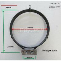 | Notes | 2700Watt Triple Loop Fan Forced Oven Element with Studs P/N: EU014, Replaces Omega - Smeg 806890122 (2600watt), 806890386, 806890118, 806890386 (2700watt) Also similar to part numbers SM14107, 613271, C00149135, 610248577, 6102485 2700Watt, 230Volt Dimensions - 19.5cm diameter, length 23cm from front mount to bracket centre Mounting studs 56mm apart on a fixed bracket Suit to:Smeg model SA360X, SA420X SDO10 SDO10-5 SDO10-6 SDO8 SDO8-5 and others |